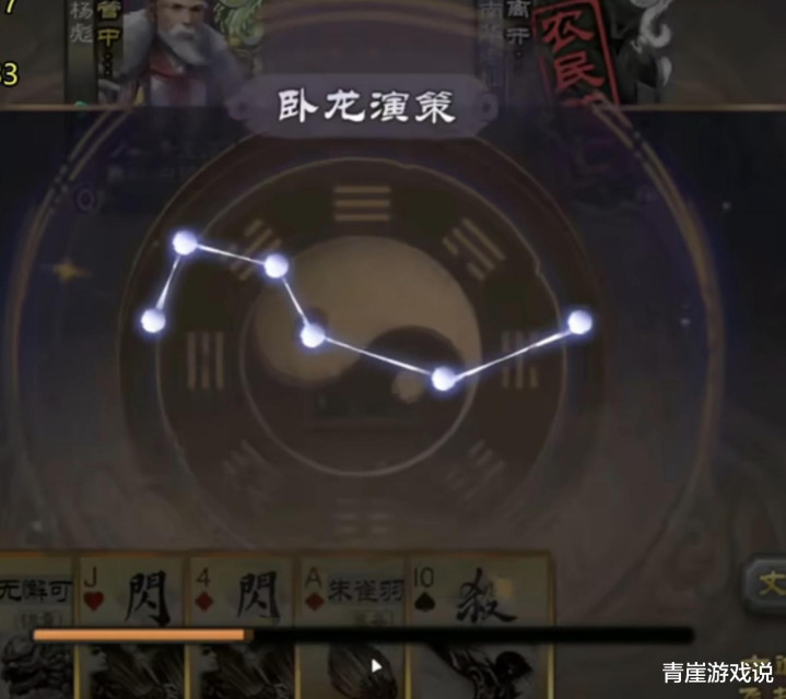 卧龙演策看起来高大上,实际上就是一个猜猜乐。一技能【演策】,在首轮开始时或准备阶段,发动一次“卧龙演策”,每猜对一次牌,那么就摸一张牌,最多摸五张。根据猜对的数量获得对应的奖惩,如果全部猜对,那么下一次发动“卧龙演策”时,可以猜的数量+1。