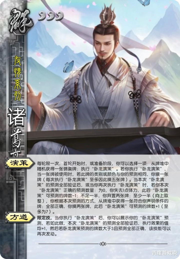 友诸葛亮的技能描述过于复杂,明明是想让他高强度的,设计师也明明可以设计直接摸牌,偏偏要整出卧龙演策这种奇形怪状的东西,新玩家不感兴趣,老玩家看了也摇头,青崖表示根本不懂设计师想法!